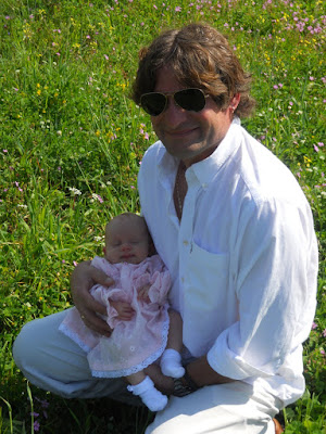 It is wildflower city around here these days. So, on the way home from Maria's churching, we stopped by our land (which Christos' mom has all tilled and planted and ready for summer) and snapped a few shots of our pretty baby and family.